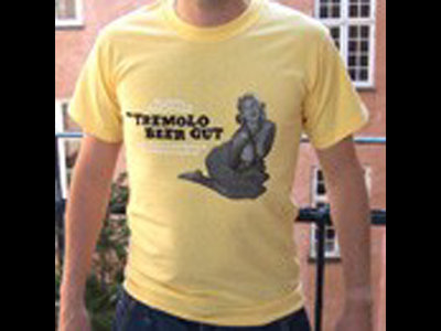 Yellow T-shirt with white and black print. Logo: Tremolo Babe+Reverb and Booze Rules Supreme.